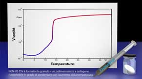 Con l’aumentare della temperatura da 0°C (1°C/min), la viscosità del gel raggiunge il minimo a +4°C. In seguito la viscosità aumenta rapidamente fino a stabilizzarsi oltre i 13° C. A temperatura ambiente e corporea OsteoBiol® TSV Gel ha consistenza di gel colloso: non indurisce mai e mantiene una viscosità che ne permette la miscela con i granuli OsteoBiol® Gen-Os®.